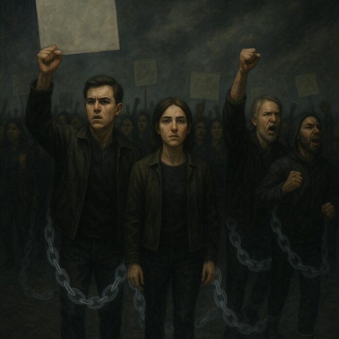 Sobre la paradoja de una rebelión que obedece y una ciudadanía que, creyéndose libre, abraza sus cadenas con fervor burocrático.