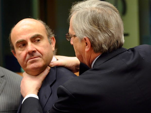 “Tengo el honor de dirigirme a usted en nombre del Gobierno de España, para solicitar formalmente asistencia financiera para la recapitalización de las entidades financieras españolas que así lo requieran”. Con una nota de prensa apresurada y deslabazada (se repite 13 veces la palabra “financiera” en 5 párrafos), el ministro de Economía, Luis de Guindos, rubricó el mal trago de tener que inclinarse ante el presidente del Eurogrupo, Jean-Claude Juncker. El euro exige la genuflexión en un día en el que se ha conocido además que los “hombres de negro” están ya en España y se han instalado tanto en el Banco de España, el Ministerio de Economía como incluso en la propia Moncloa. Y hay veces en que una imagen vale más que mil palabras, pues la curiosa fotografía que ilustra este artículo no es un montaje: recoge el momento en que Juncker saluda a De Guindos en tono aparentemente distendido durante la última reunión del Eurogrupo.