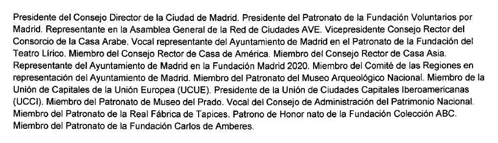 Gallardón tuvo que presentar dos veces su Declaración de Intereses. En la primera de ellas, escrita de su puño y letra, se decía solamente “alcalde de Madrid” y “vocal del Consejo de Administración de Patrimonio Nacional”. En la segunda, en la que renunciaba a su sueldo de alcalde (no figura la cantidad) para quedarse con el de diputado (tampoco se consigna) tras el pacto alcanzado con Ana Botella, del que nada sabían sus electores, se escribe ya a ordenador la siguiente relación: