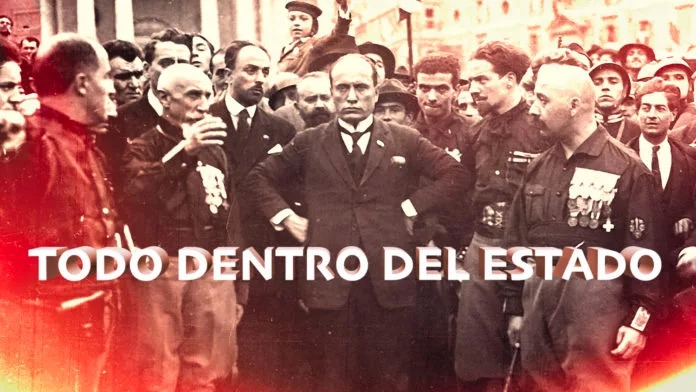 “(…) Ni agrupaciones (partidos políticos, asociaciones, sindicatos), ni individuos fuera del Estado (…). El fascismo quiere un Estado fuerte, poderosamente organizado e incluso apoyado sobre una amplia base popular. El Estado fascista se atribuye también el dominio económico. Gracias a las instituciones corporativas, sociales, económicas, creadas por él, el influjo del Estado penetra hasta los más lejanos tentáculos, mientras que dentro del Estado circulan, encuadradas en sus organizaciones respectivas, todas las fuerzas políticas, económicas e intelectuales de la nación.”