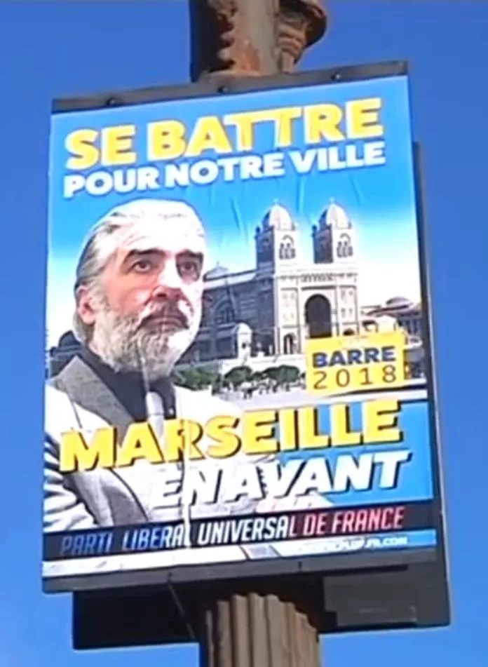 una farola un cartel de propaganda electoral donde un candidato se postulaba para elecciones … en Marsella.