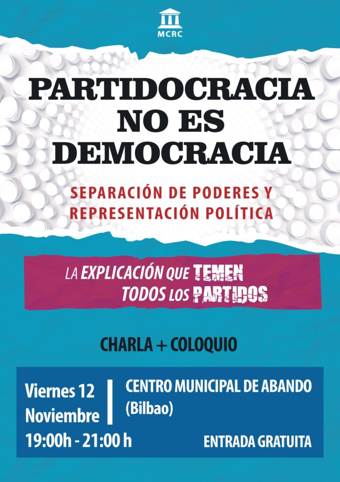 Ayer, 13 de noviembre de 2021, a las 19:00, se celebró una charla en el Centro Municipal de Abando (Bilbao, Vizcaya), organizada por los repúblicos del norte. La charla, que se centró en diferenciar la partidocracia de la democracia, fue impartida por Alex del Cura Lloves, Javier Villoslada Aja y Bernardo Garrido Fernández.
