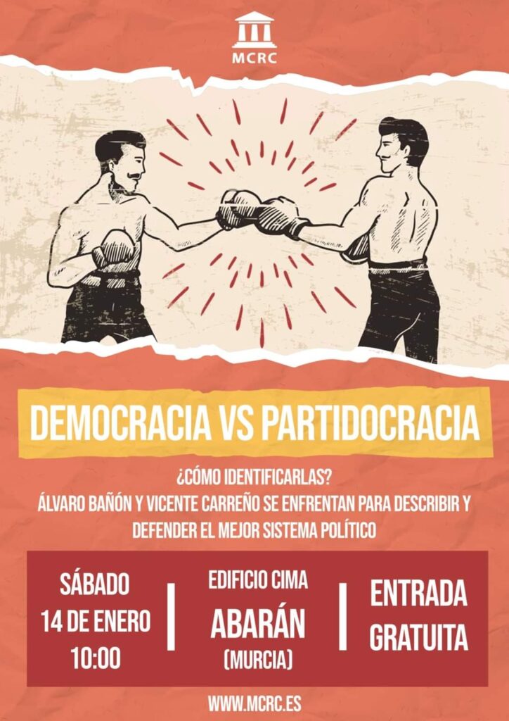 El debate, el cual se ha desarrollado en la sala Adolfo Suárez del edificio CIMA, ha enfrentado a Álvaro Bañón, quien, haciendo de abogado del diablo, ha defendido la opción partidocrática, contra Vicente Carreño, que ha defendido la república constitucional que propone el MCRC.