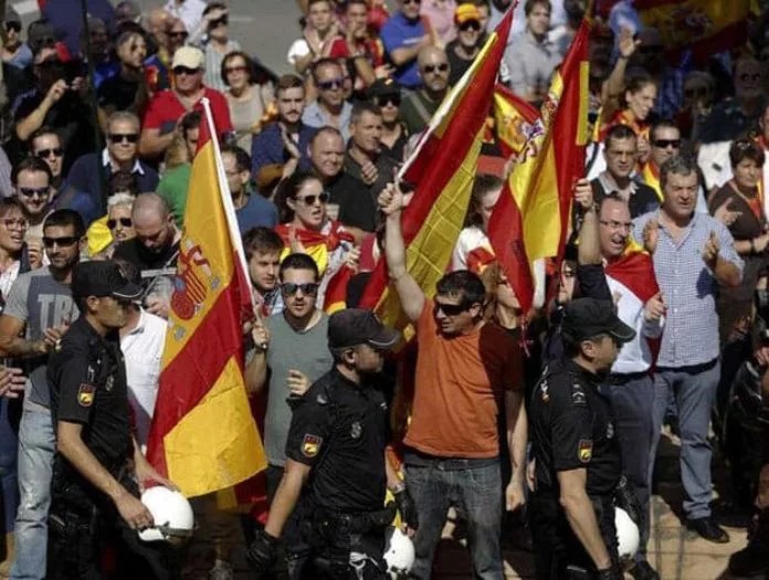 Inmediatamente, numerosos medios de información, incluso los que no tenían ningún periodista sobre el terreno, calificaron a los manifestantes de ultras y nazis, tal y como hizo el diario La Varguardia, que además tachó la manifestación de “concentración tumultuaria”, como si fuera a arder Troya o se mascara la tragedia. También propagaron el bulo de que en el evento no había suficiente seguridad, porque muchos efectivos de la policía habían sido trasladados a Cataluña… según el sinvergüenza de Puigdemont, para perseguir urnas.