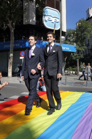 Un día, un grupo de homosexuales del PP escribimos a Aznar diciéndole que habíamos decidido constituir la Plataforma Popular Gay pero no recibimos contestación alguna (1). De modo que redactamos los estatutos y los presentamos ante el registro de asociaciones. Puede formar parte cualquier simpatizante, votante o miembro de Nuevas Generaciones o del Partido Popular. Hemos ido creciendo como la espuma y es algo que ha surgido desde dentro como una necesidad. Fue Mercedes de la Merced la primera que lo vislumbró cuando en los informativos de Tele 5 salió diciendo: “Nos parece muy bien que los miembros del Partido Popular digan “soy gay, soy del Partido Popular” y se junten entre ellos, se organicen y luchen por sus derechos. Evidentemente hay una afinidad política de ideas. No olvidéis, (esa fue la primera vez que se dijo) que al PP le han votado entre 750.000 y 800.000 homosexuales y tienen derecho a organizarse.”