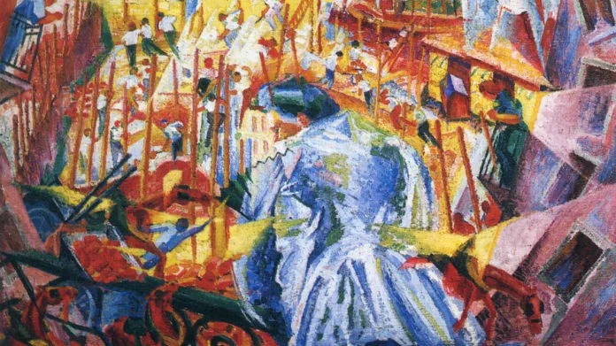 En este cuadro de Umberto Boccioni, La strada entra nella casa (1911) uno de los pintores apreciados de D. Antonio García-Trevijano, se representa a una mujer asomada al dinamismo de la calle, que el pintor revive en la agitación poliédrica de las formas arquitectónicas, en la febril actividad de los obreros multiplicada por los postes y los escorzos de los caballos, forma clásica de representar el movimiento. Con todo ello, Boccioni rechazaba la mímesis estática de la realidad del arte figurativo académico, y hacía evidente la simbiosis del sujeto sensible y del objeto percibido.