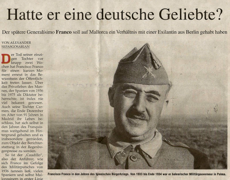 Sería un chisme histórico de lo más apetecible, si dispusiera de alguna prueba sólida que lo fundamente: Francisco Franco, dictador, jefe de Estado y el militar más exitoso de toda la historia de España, liado con una modistilla judía escapada de la Alemania nazi. Lo cuenta Alexander Sepasgosarian, periodista de Mallorca Magazin, semanario informativo de los alemanes residentes en la Isla -en su número 2 del 2018- y autor de un libro de investigación histórica titulado Mallorca unterm Hakenkreuz 1933-1945 (Mallorca bajo la cruz gamada 1933-1945; Matrix Media Verlag, Göttingen 2017). Durante los años 30, la colonia alemana de Mallorca, ya relativamente numerosa después de una larga historia de viajes turísticos y relaciones comerciales entre España y el Reich, presenció la formación de una escena novelesca muy al estilo Casablanca o Lisboa durante la Segunda Guerra Mundial, con agentes nazis intentando hacerse con el control local, espías de las grandes potencias europeas y todo tipo de aventureros bregando afanosamente por la conquista del día a día en consulados y cafeterías. A ello se sumaron, a partir de 1933, los refugiados políticos que huían del régimen de Hitler, sobre todo intelectuales liberales y de izquierda y, por supuesto, numerosos judíos. Entre estos últimos debía encontrarse una tal Fräulein Singer, de profesión costurera, que abrió en Palma un negocio dedicado a la confección y las telas de calidad, y que supuestamente habría conocido a Franco durante la época en que éste fue gobernador militar de Baleares, desde 1933 a finales de 1934.